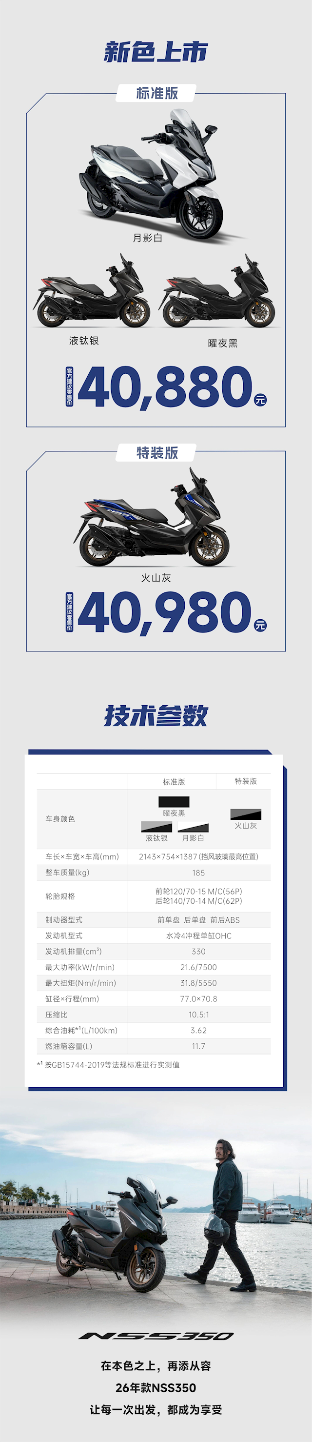 快科技4月15日消息,昨晚,本田中排量踏板标杆车型,新款NSS350(俗称“佛沙350”)正式上市,标准版售价40880元,特装版40980元。