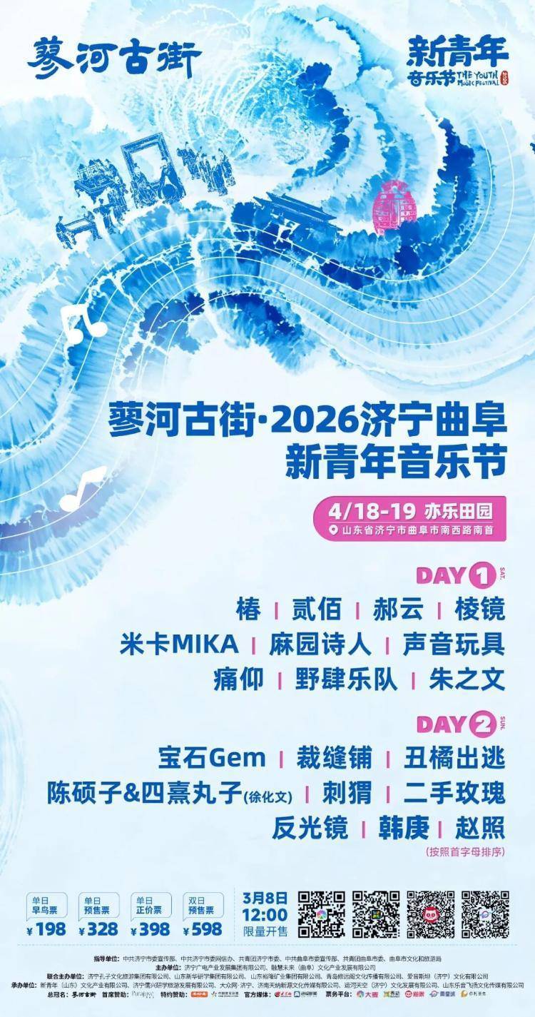 蓼河古街·2026济宁曲阜新青年音乐节由中共济宁市委宣传部、中共济宁市委网信办、共青团济宁市委、中共曲阜市委宣传部、共青团曲阜市委、曲阜市文化和旅游局指导,济宁广电产业发展集团有限公司、融慧未来(曲阜)文化产业发展有限公司主办,济宁孔子文化旅游集团有限公司、山东新华研学集团有限公司、山东裕隆矿业集团有限公司、青岛修远阁文化传播有限公司、爱音斯坦(济宁)文化有限公司联合主办,新青年(山东)文化产业有限公司、济宁儒兴研学旅游发展有限公司、大众网·济宁、济南天纳新源文化传媒有限公司、运河天空(济宁)文化发展有限公司、山东乐音飞扬文化传媒有限公司承办。本活动由蓼河古街总冠名,Purajuve塑妍真首席赞助,中国禽类制品高端品牌——德州扒鸡®、中国体育彩票特约赞助。两天时间,19支乐队/歌手齐聚济宁市曲阜市亦乐田园,远方朋来,礼乐相迎。新青年,On the way,此站济宁曲阜,我们现场见。