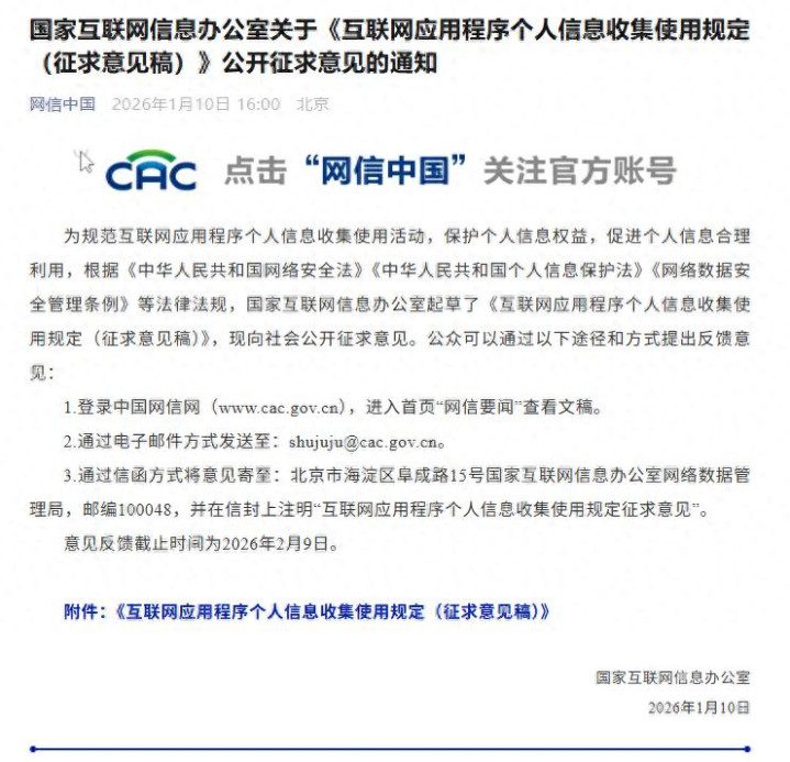 红星资本局1月10日消息,今日,据“网信中国”消息,为规范互联网应用程序个人信息收集使用活动,保护个人信息权益,促进个人信息合理利用,国家互联网信息办公室起草了《互联网应用程序个人信息收集使用规定(征求意见稿)》,现向社会公开征求意见。意见反馈截止时间为2026年2月9日。