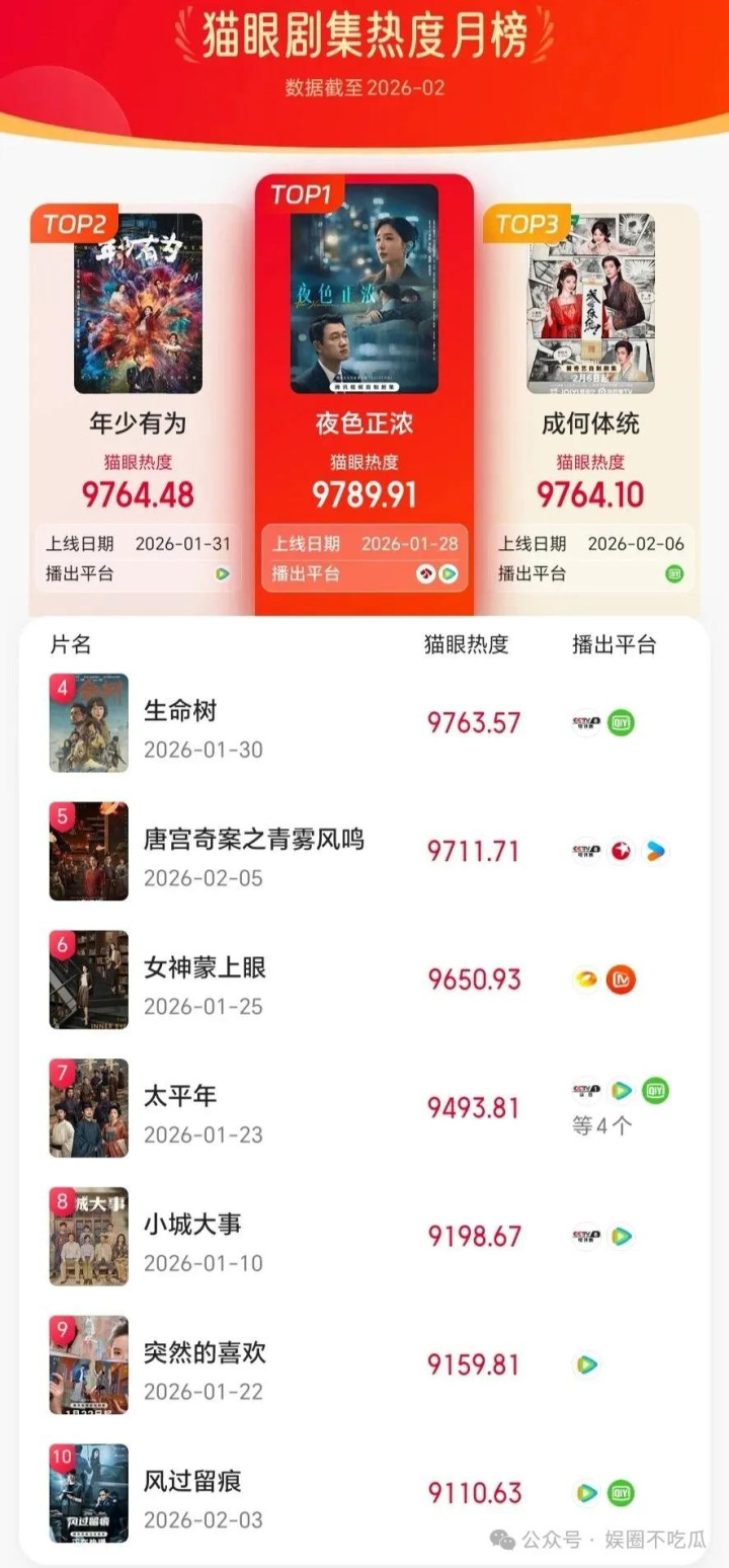 根据猫眼剧集热度月榜(数据截至2026年2月),我盘点了这个月最火的10部国产剧~春节追剧可以看这篇,本篇也算得上的追剧指南了。